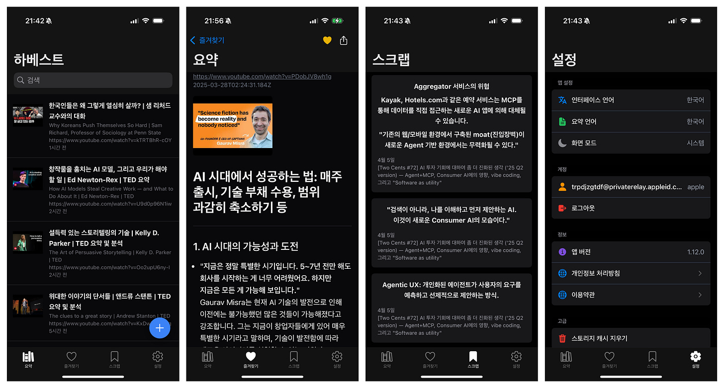 요즘 LLM의 대화 능력과 추론 능력이 좋아졌으니 일정 기간 동안 내가 관심있게 읽고 본 글과 영상들을 요약해 인풋으로 줄 수 있다면 다양한 질문과 대화를 나눠볼 수 있을 것이라 기대했다. 이를 실행하기 위해 내가 보고 읽은 모든 콘텐트를 요약해 저장하고 관리할 수 있는 ‘하베스트’라는 앱을 만들고 4개월 동안 랩탑과 아이폰에서 소비한 모든 콘텐트를 모았다.
